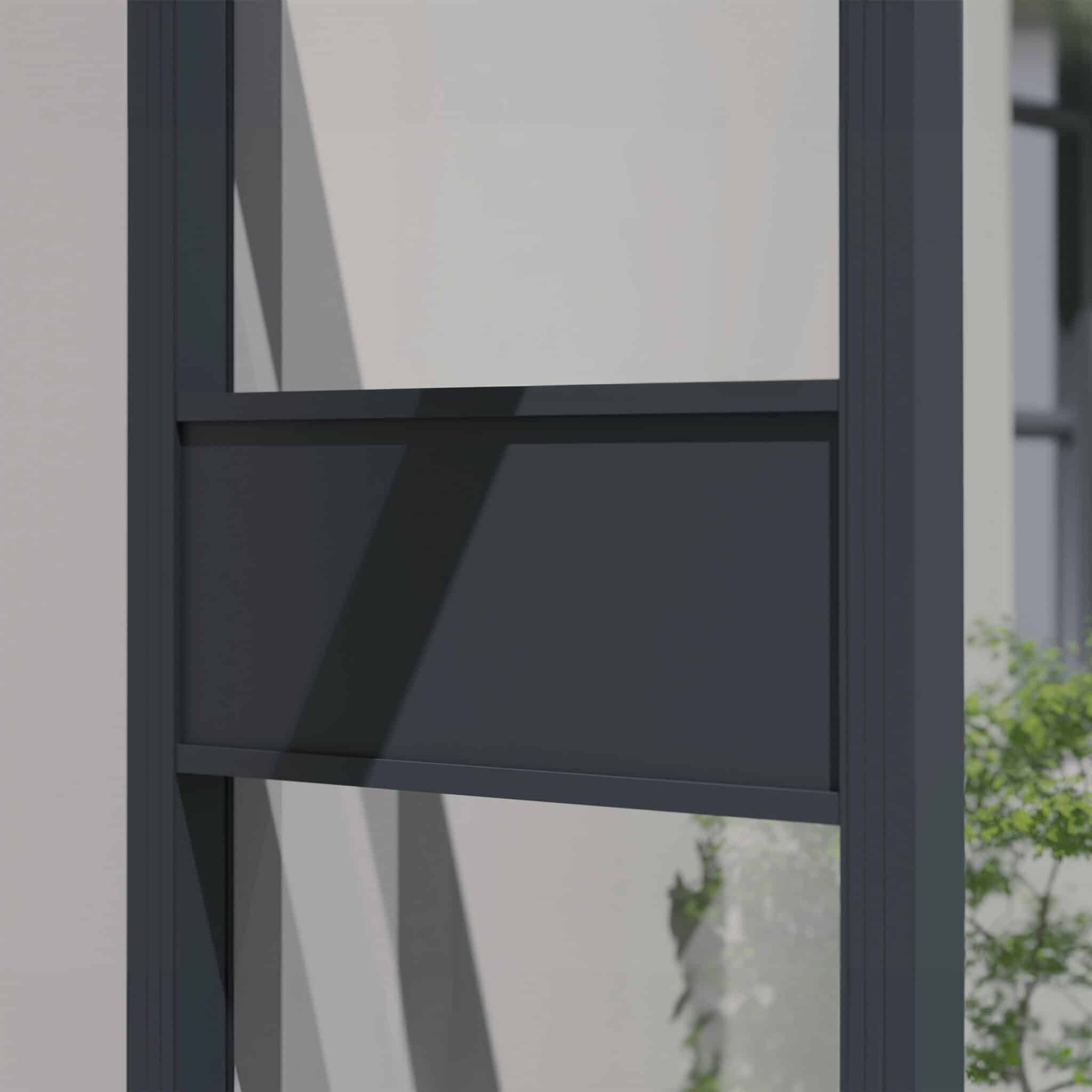 Sophia גגון בעיצוב מודרני בעל קו נקי, מסגרת אלומיניום בצבע אפור אלגנטי ולוח אפור שקוף המשדרג את המראה החיצוני של הבית.