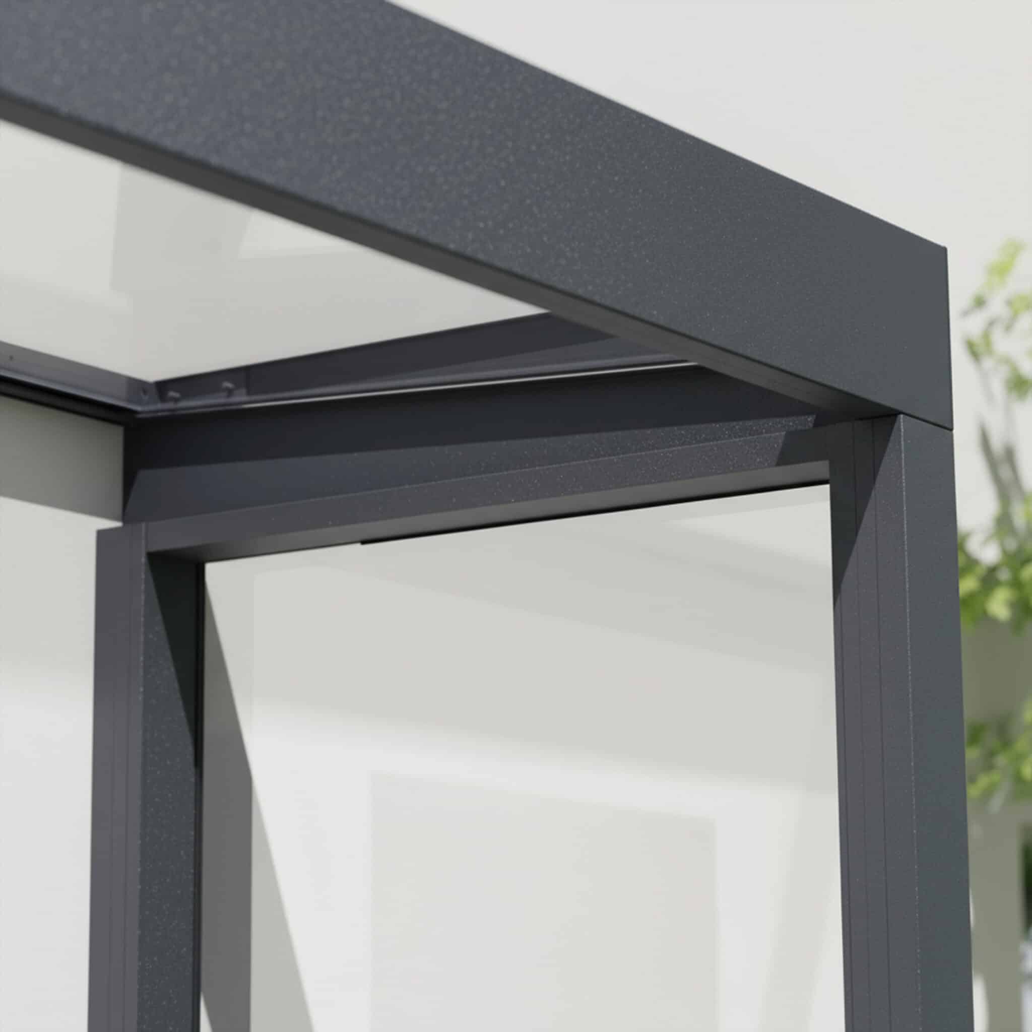 המסגרת בצבע אפור כהה בשילוב פנלים שקופים יוצרת מראה מודרני ונקי המשתלב בצורה טבעית עם הגגון, ומעניקה תחושת נוחות והגנה לאורך כל השנה — ללא צורך בתחזוקה שוטפת.